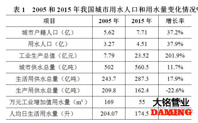 2005~2015年期間,城市戶籍人口、用水人口數量和工業生產總值大幅度提高,城市供水總量僅增長了11.7%。同期,萬元工業增加值用水量下降了67.5%,人均日生活用水量降低了14.5%,生產用供水總量下降了22.6%,生活用供水總量僅增長了17.9%(見表1)。