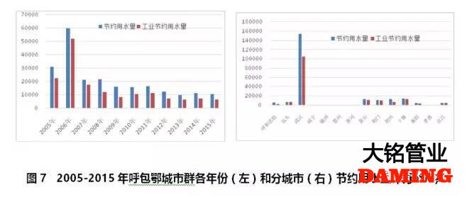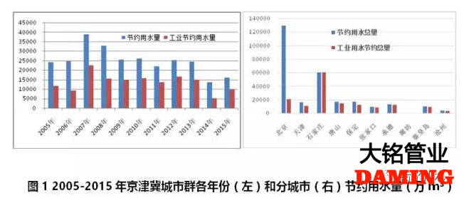 京津冀城市群水資源十分缺乏,但在用水效率提高的前提下,可以通過調整產業規劃與用水定額來實現用水總量的零增長。2005-2015年期間,2007年節約用水量達到高峰,之后逐年下降(見圖1左)。