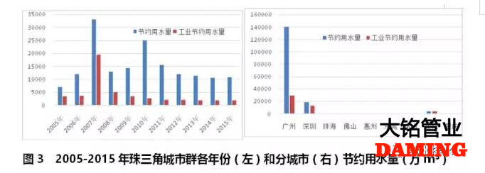 珠三角城市群2005-2015年期間,只有廣州市有完整的節約用水數據,深圳、東莞、江門和肇慶2010年前有個別年份的節約用水數據,珠海、佛山、惠州和中山則完全沒有進行統計。2008年整個城市群節約用水量達到高峰,之后逐年下滑(見圖3左)。工業節約用水比重占全部節約用水總量的29.2%,廣州市為21.4%(見圖3右)。