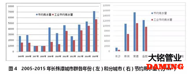 長株潭城市群2005-2015年期間,節約用水量從2013年一年呈增長趨勢,70%的節約用水來自工業部門(見圖4左)。該城市群沒有一個城市對節約用水數據進行連續統計,湘潭、益陽、衡陽和婁底四個城市則完全沒有節約用水統計數據,株洲、岳陽和常德三個城市節約用水量占城市群節約用水總量的99.6%(見圖4右)。事實上,長株潭城市群2003年至2011出現了嚴重的缺水狀況,已經嚴重影響了該區域經濟發展[4]。節約用水勢在必行。