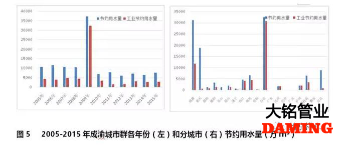 成渝城市群2005-2015年期間,除去2009年異常值外,各年份節約用水總量低于1億m³,工業節約用水占比為52.8%(見圖5左)。成渝城市群節約用水主要來自成都、自貢和重慶(占全部節約用水總量的67.33%);廣安、巴中、雅安沒有統計節約用水;工業用水節約占比前三位的城市分別是達州、瀘州和自貢;重慶市工業節約用水占比為3.5%(見圖5右)。
