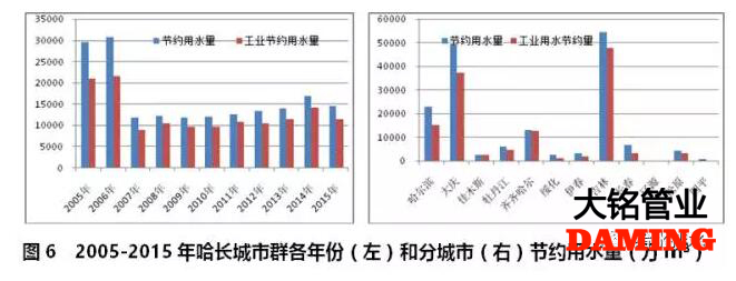 哈長城市群2005-2015年期間,2005年和2006年節約用水量達到高峰后,一直維持在每年1.5億噸左右(見圖6左)。節約用水總量前四位依次是吉林、大慶、哈爾濱和齊齊哈爾,占全部節約用水量的84.7%;工業用水節約總量占比為77.6%(見圖6右)。在節約用水數據統計方面,只有吉林省的遼源市和佳木斯市數據缺失嚴重,其他城市數據完整性較好。