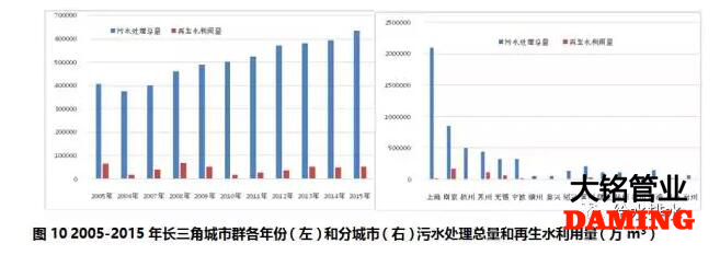 長三角城市群2005-2015年期間,污水處理總量持續增長,2015年是2005年的1.55倍。但再生水利用量并沒有顯著增長,再生水利用總量僅占污水處理總量的9%,各年份之間差異較大,總體呈現減少趨勢,2015年為2005年利用量的79%(見圖10左)。上海、南京和杭州的污水處理總量最大,僅上海市就占到全部總量的37%,三個城市總和占到全部總量的62.5%。南京市和蘇州市再生水利用量最大,分別占到全部總量的35%和23%。再生水利用較少的城市有上海、杭州、嘉興、紹興、泰州和臺州(見圖10右)。