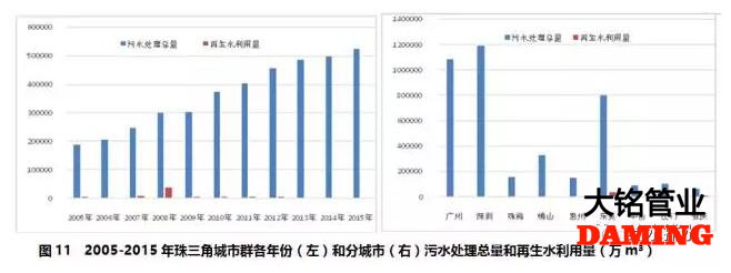 珠三角城市群2005-2015年期間,污水處理總量持續增加,但再生水利用量并沒有與之同比例增加,再生水利用總量占污水處理總量的占比僅為1.6%(見圖11左)。這可能是由于該地區雨水豐沛,污水處理后的水作為生態用水更為經濟[1]。2008年珠三角城市群再生水利用量達到峰值,且主要來自東莞市和肇慶市(見圖11右)。