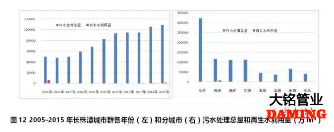 長株潭城市群2005-2015年期間,污水處理總量持續增加,2015年污水處理總量達到10億m³,是2005年的2.2倍。2002-2008年期間廢水排放總量基本與經濟增長水平保持同步遞增趨勢,且廢水排放生產率快速提高,總體環境污染負荷較高。盡管長株潭城市群2005年至2010年期間工業廢水排放達標率持續改善,但區域上中下游城市污水集中處理率分別為15.3%、31.8%、49.4%,水污染問題嚴重。2009年是長株潭城市群污水處理量提升的一個關鍵年份,2009年以后污水處理量大幅度提升,這可以有效改善區域生態環境資源承載能力。但再生水利用量沒有同比例增加,其用量僅為污水處理總量的1.2%(見圖12左)。除長沙和株洲外,湘潭、岳陽、常德、益陽、衡陽和婁底這六個城市均無再生水生產和利用行為(見圖12右)。研究表明,長株潭城市群2030年城市化率達到90%、第二產業和第三產業持續增長的態勢下,只有將污水處理率提高到100%、污水回用率提高到35%的條件下,才不會產生水資源供需缺口狀況[7]。提升城市群再生水利用率是實現水資源供需平衡的一個重要措施。