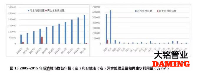 成渝城市群2005-2015年期間,污水處理總量持續增加,2015年污水處理總量達到13.8億噸,是2005年3.12倍。但再生水利用量沒有增加,反而比2005年降低了60%。總體上,再生水利用總量僅為污水處理總量的5.2%(見圖13左)。再生水利用量最多的城市是成都市,達到7.39億m³,主要來自2005-2008年期間,2008年當年利用量達到58150萬m³,但2009年僅為35萬m³,2013年以后再生水利用量為零。重慶市自2006年啟動再生水利用以來逐年增加,從2006年的118萬m³,增長到2015年的854萬m³,增長了7.23倍。沒有統計或再生利用較少(見圖13右)。
