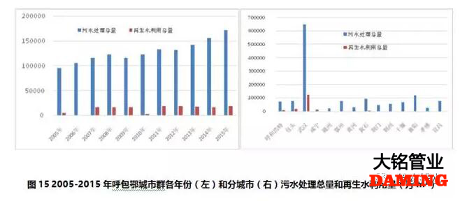呼包鄂城市群2005-2015年期間,污水處理總量持續增加,2015年是2005年的1.79倍;再生水利用占污水處理總量的10.5%,2015年是2005年的3.5倍,2011年再生水利用量增長幅度很小(見圖15左)。再生水利用主要來自三個城市,武漢市、包頭市和呼和浩特市,占城市群全部再生水利用總量的97%,武漢市更是占到了81%,黃石和十堰市有很小比例的再生水利用(見圖15右)。