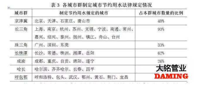長三角城市群是7個城市群中節約用水立法制定最好的城市群,很多城市根據本地水資源狀況和人口、產業發展趨勢制定了節約用水辦法,并提出了適合本地特點的節約用水政策措施。