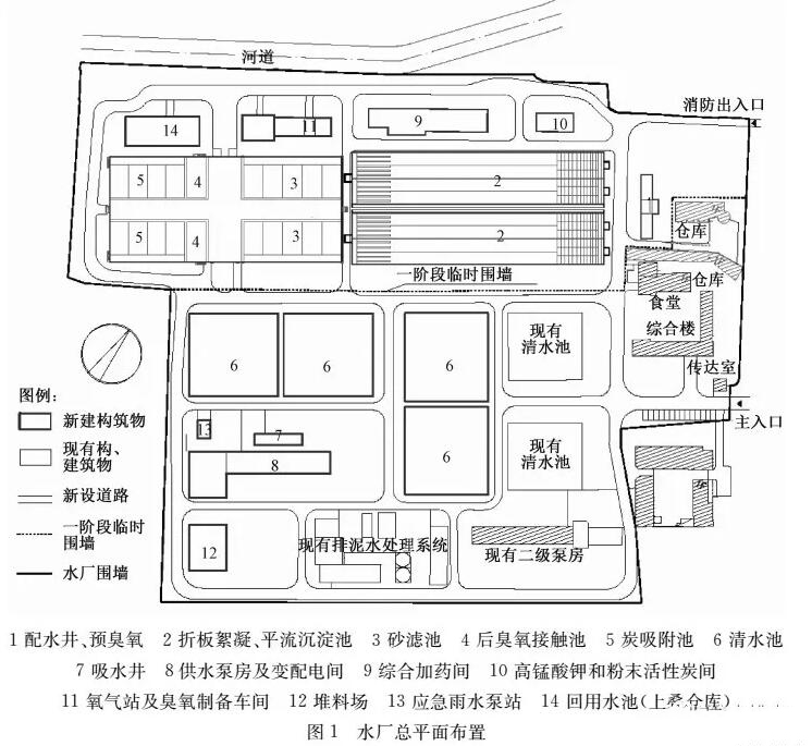 (1)構(gòu)筑物多、設備陳舊、總圖凌亂。水廠自建成的近60年時間里,先后經(jīng)歷多次擴容、改造,形成了現(xiàn)在多個處理構(gòu)筑物,總圖布置分散、凌亂,且多個構(gòu)筑物和很多設備都存在問題。如現(xiàn)有吸水井分為高、低水位2格吸水井,多年運行管理實踐表明高、低水位運行切換麻煩,節(jié)能效果也不明顯;加藥間設備陳舊需要逐一更換,其內(nèi)部布置、土建分隔亦有多處需要改造,而且現(xiàn)有工藝設備也不能滿足新增加藥劑的要求;水廠的清水池庫容僅2.2萬m3,庫容偏小;2座二級泵房和2座原水泵房內(nèi)水泵機組匹配都不合理、效率低下、自動化程度低。