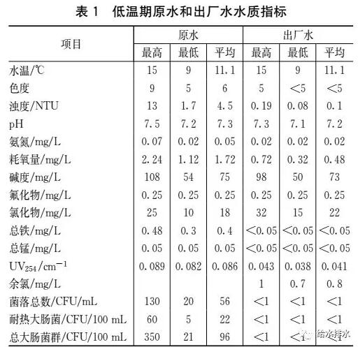 自2016年6月30日建成投產(chǎn),水廠運行可靠,處理效果良好,出廠水水質(zhì)優(yōu)于國家標準,在低溫低濁期,最高出廠水濁度穩(wěn)定低于0.19NTU、耗氧量小于0.72mg/L、色度不高于5,具體水質(zhì)如表1所示。